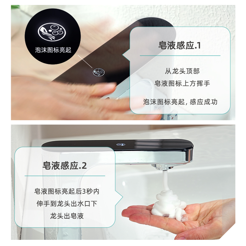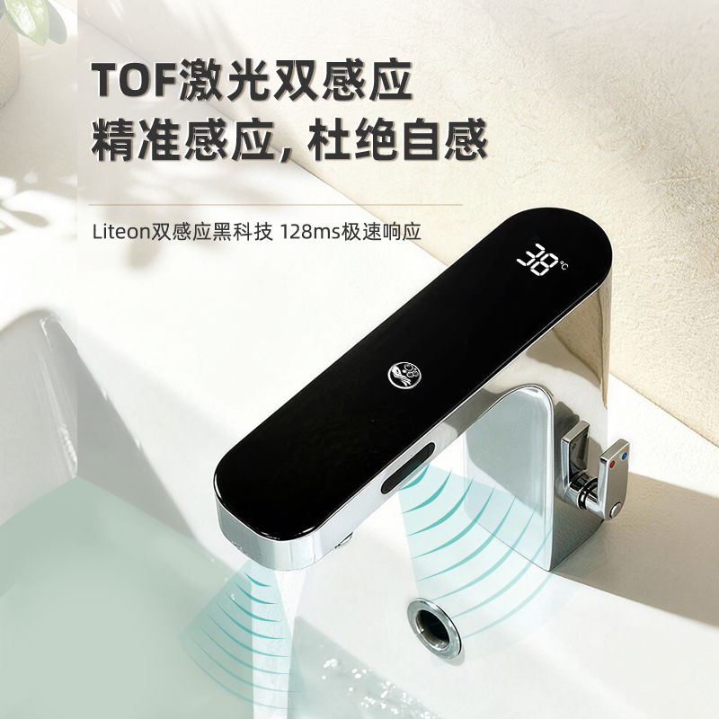 出水和皂液二合一龍頭設計 & 帶溫度數顯感應龍頭 & TOF激光感應器 & Liteon雙感應技術。